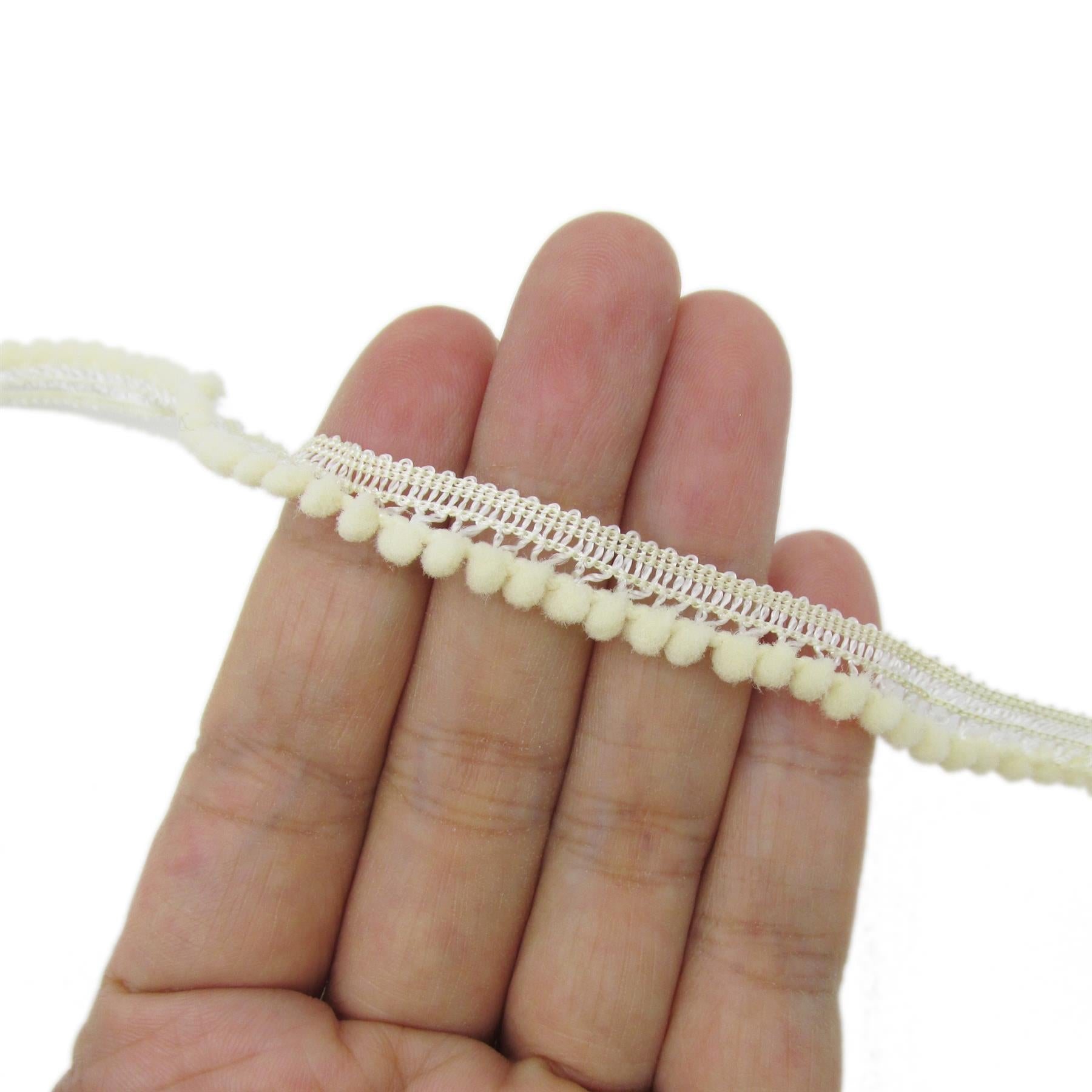 1. Sold by the metre, supplied on continuous lengths where possible. 2. 4mm Poms, attached to a header. Total width 10mm. This can be used as a delicate fringe, or the header can be sewn in to an edge to act as a pompom piping.