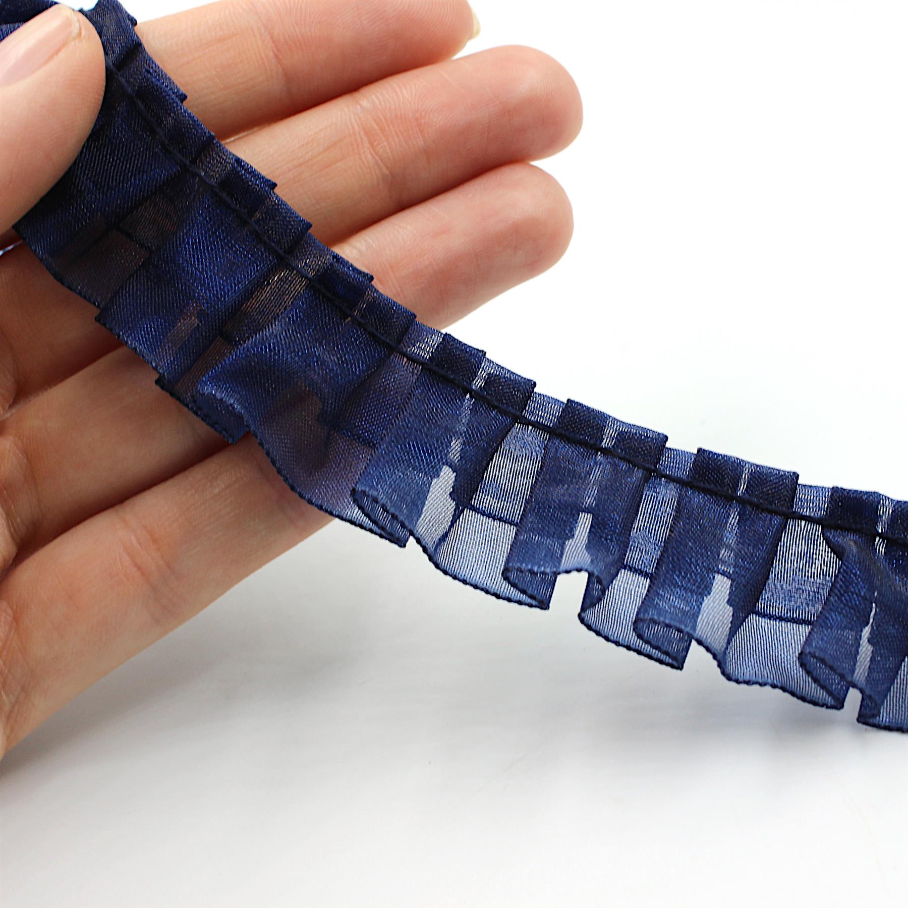 1. Organza ribbon, folded over to give a layered effect, loosely box pleated. 2. Sold by the metre, supplied on continuous lengths where possible.