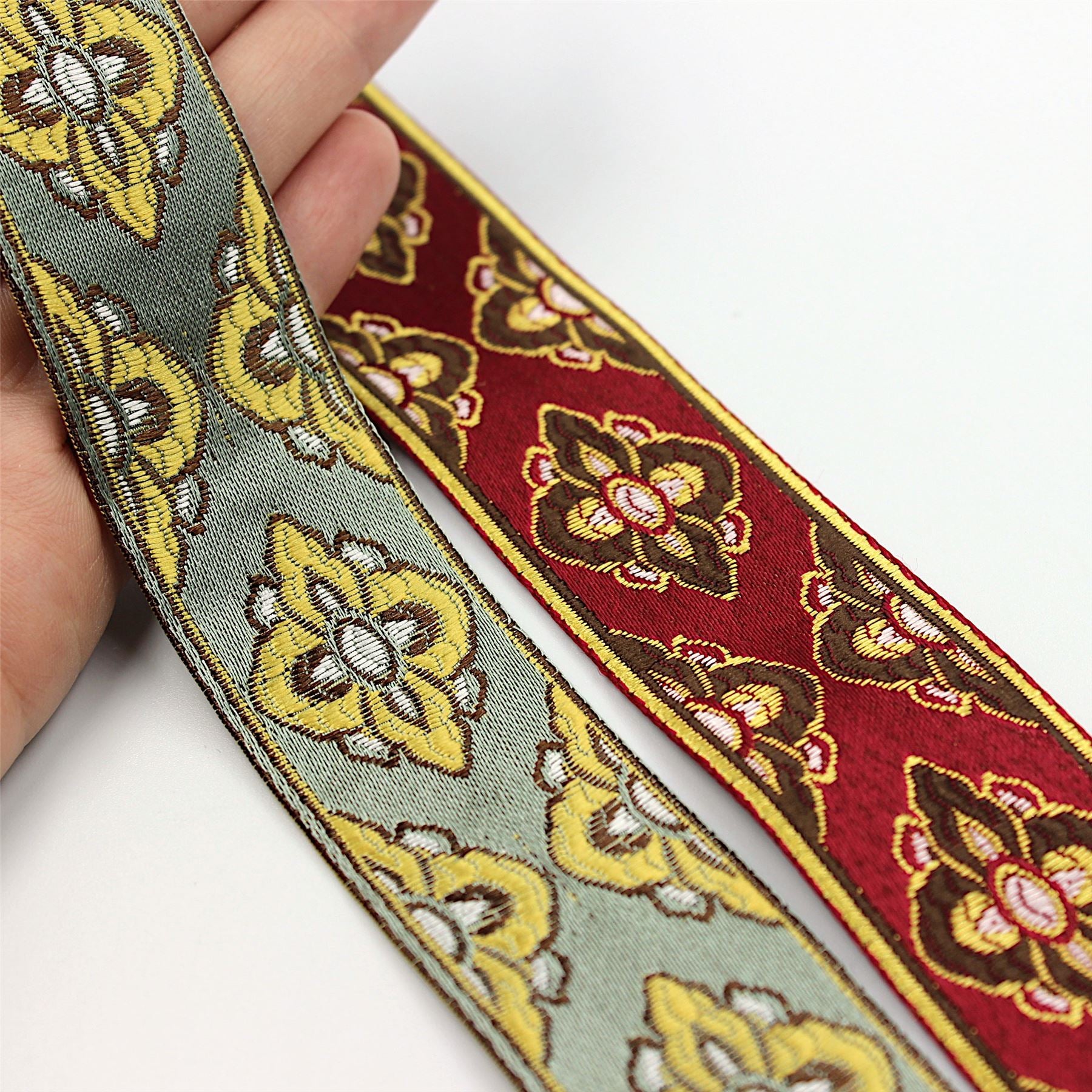 1. Both colours embroidered with gold and brown detail. 2. Sold by the metre, supplied on continuous lengths where possible.