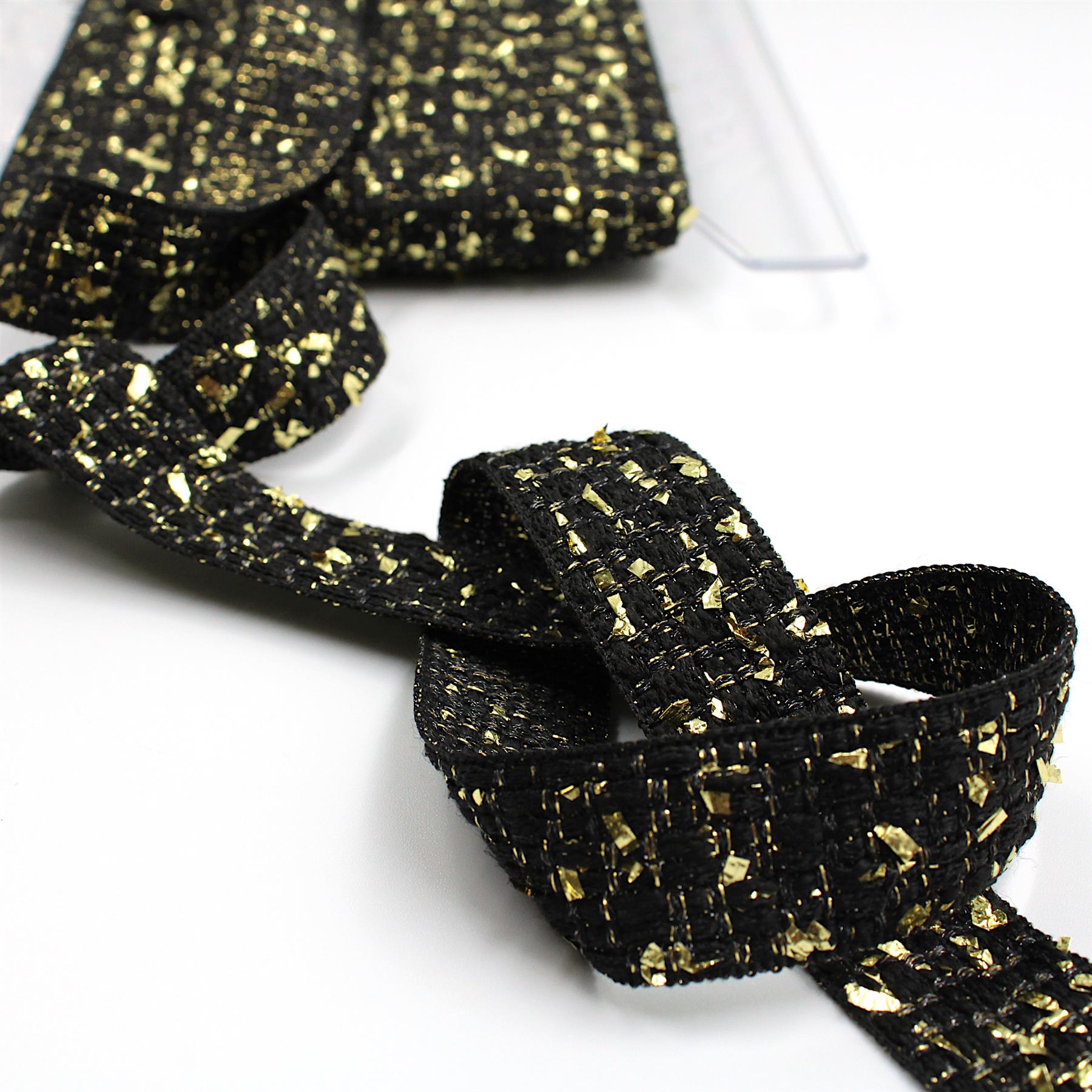 A lovely textured black braid with shiny flecks of gold scattered throughout, emanating a 'gold leaf' look. Ideal for furnishing, costume and upholstery.