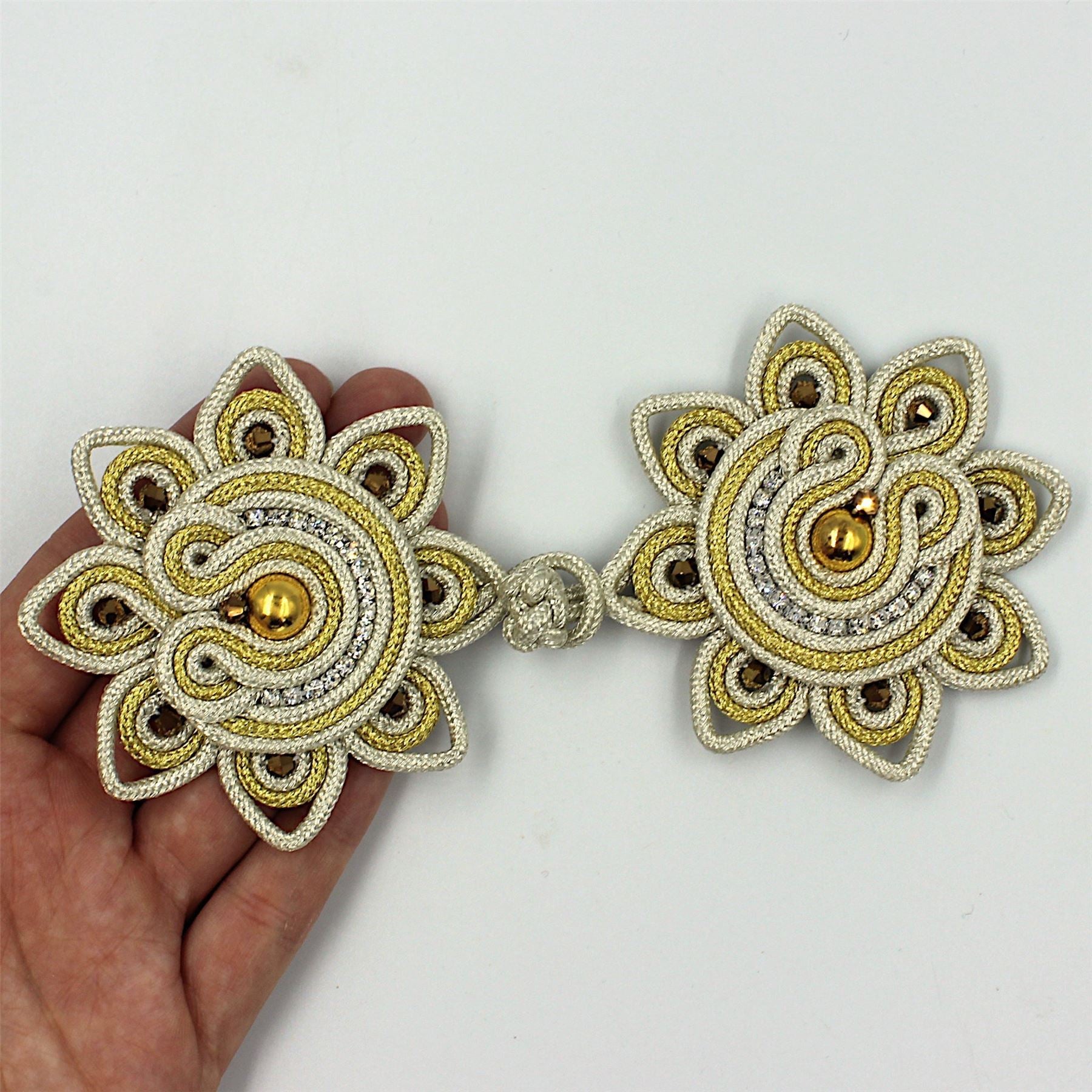1. Sold as a set of 2 parts (left and right). 2. Gorgeous slightly metallic cord with beads and rhinestone gems. 3. 16cm total width.