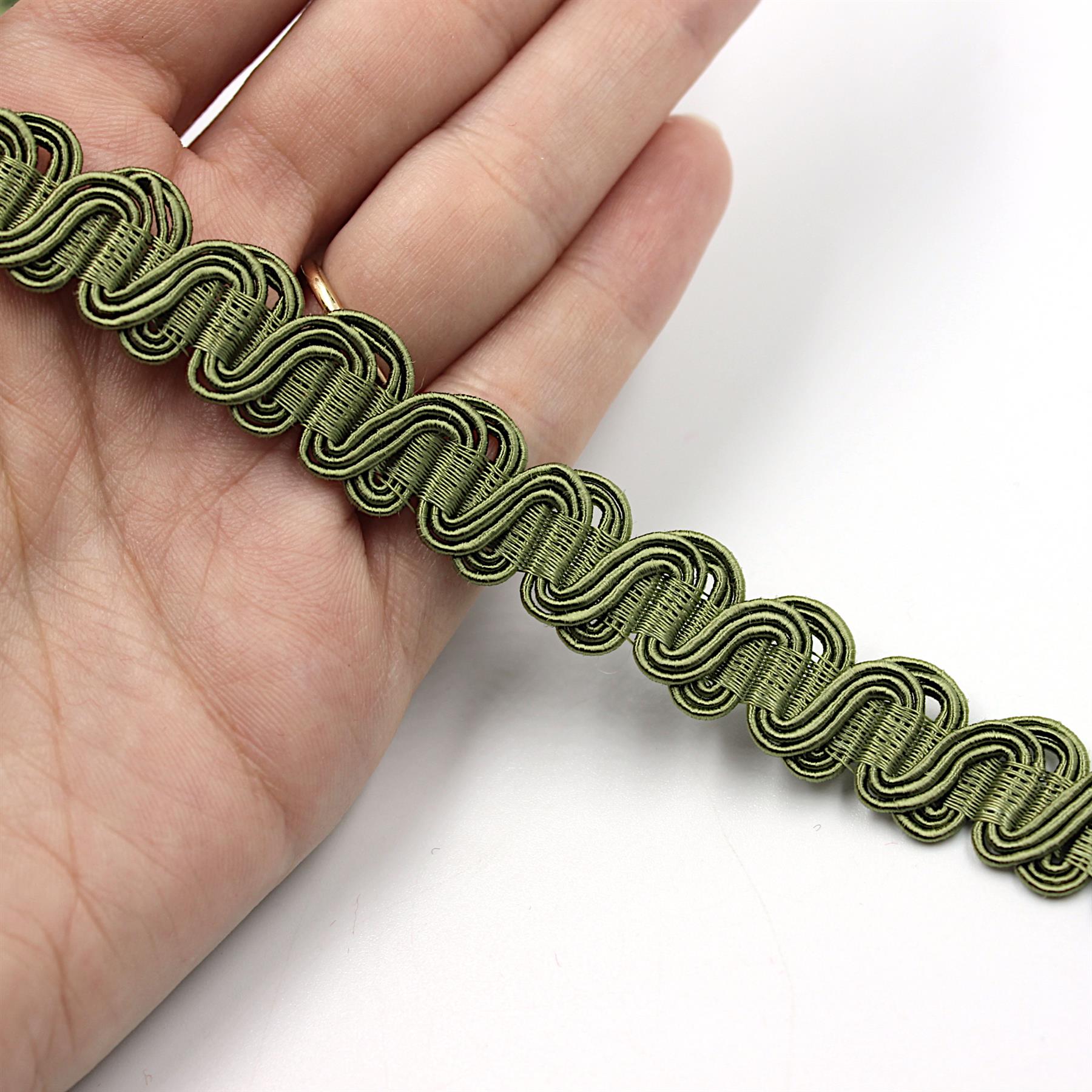 A classic furnishing gimp braid, featuring an intricate scroll design, perfect for upholstery, lampshades, and costumes.