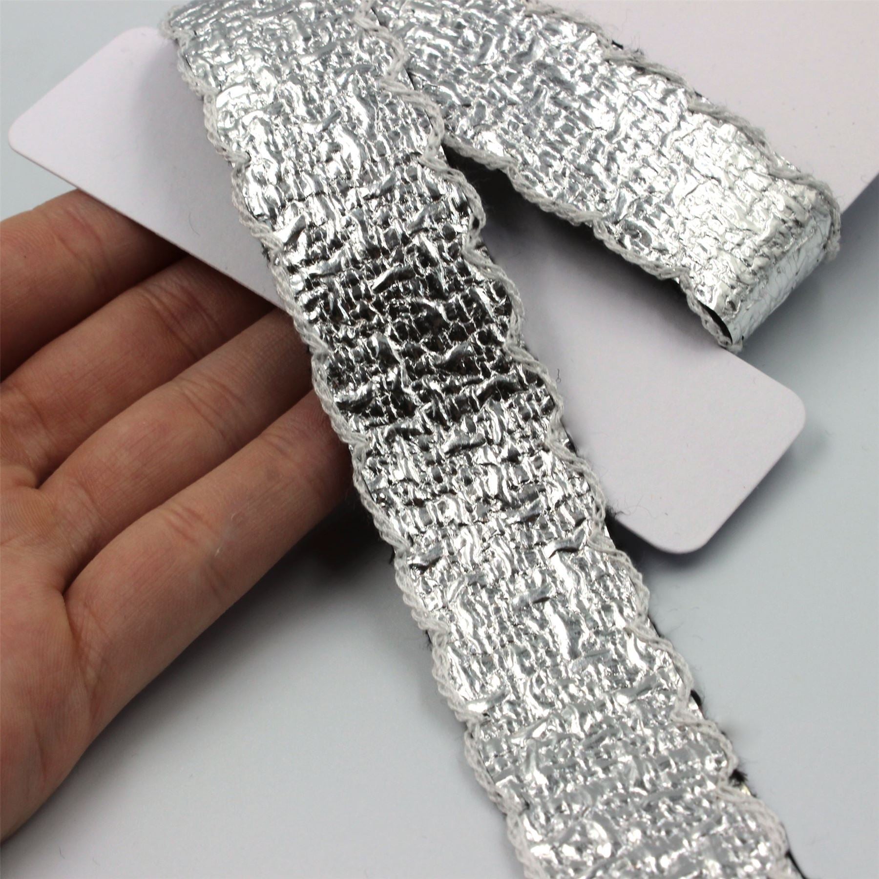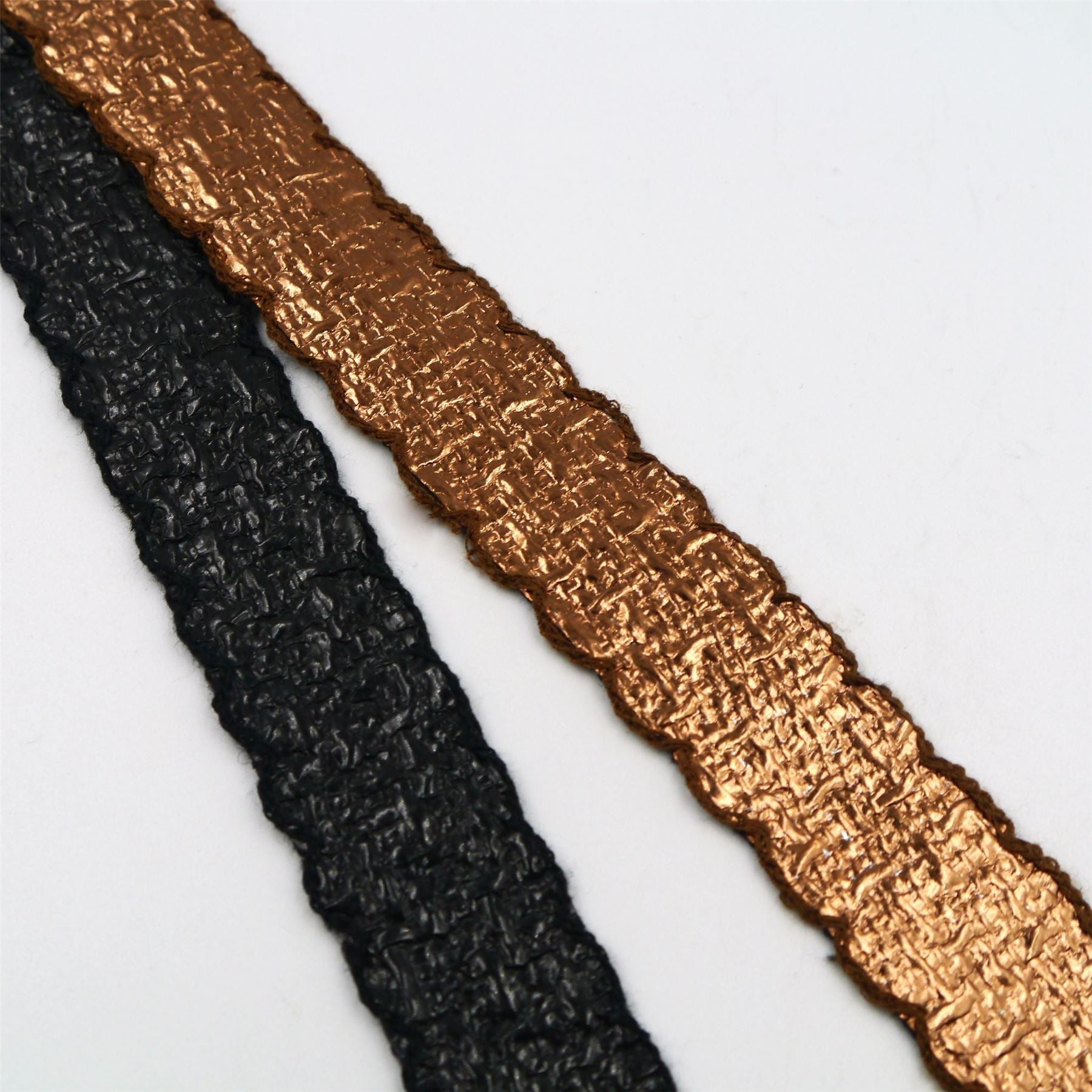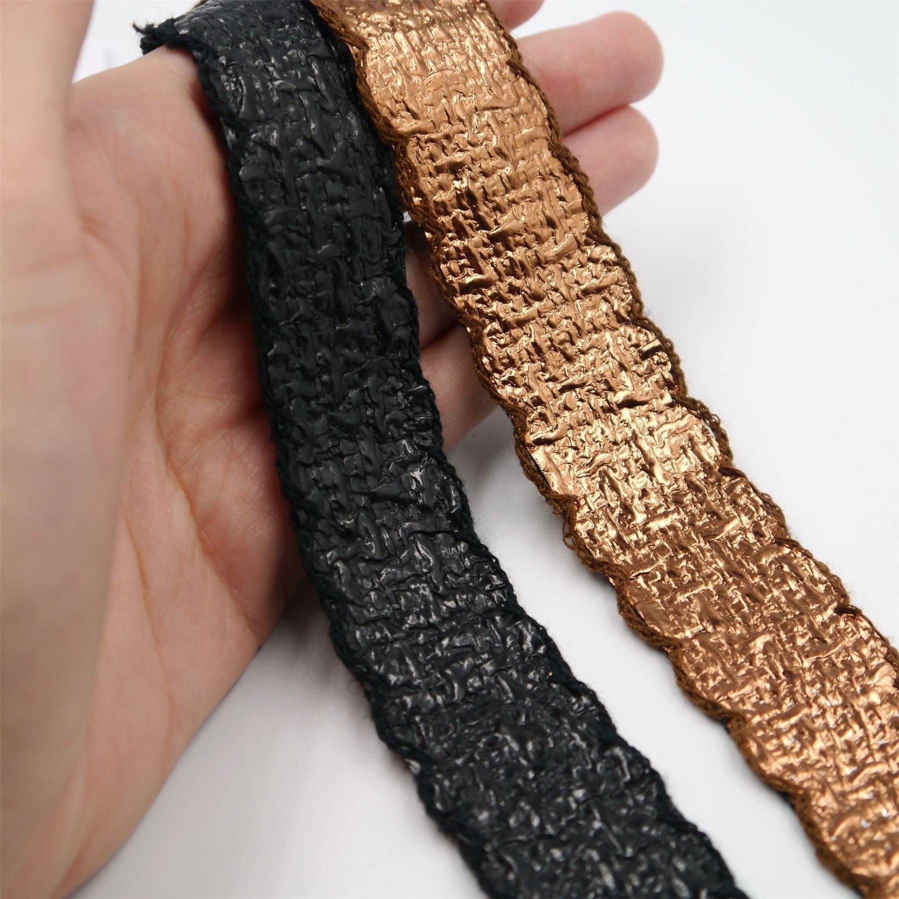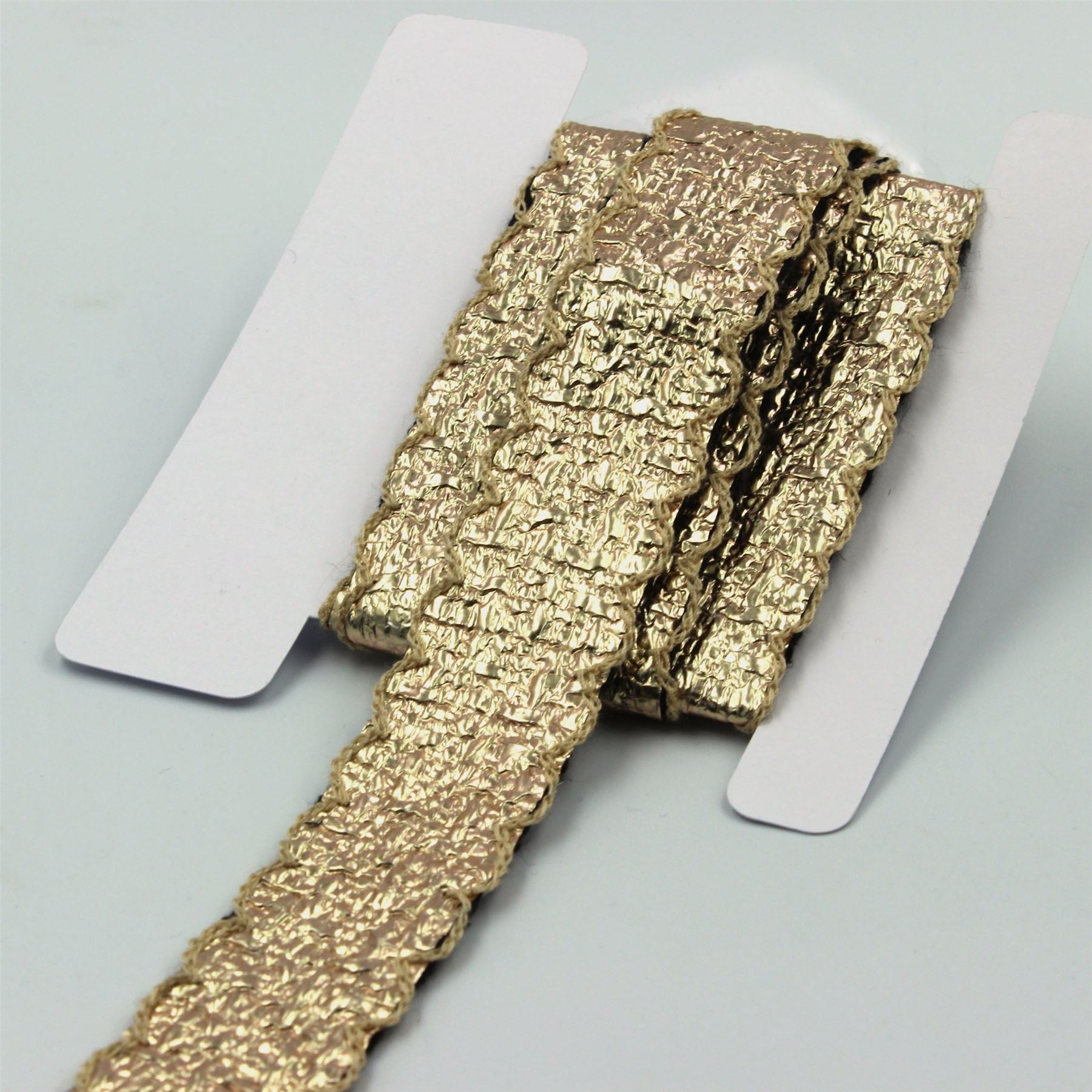 1. Sold by the metre 2. Available in black, gold, silver or bronze 4. All colours available in 25mm, Gold is also available in 40mm This unusual braid features a thick woven base, topped with a metallic foil effect. It's glossy finish allows the texture of the braid below through, creating an eye-catching appearance, unlike many others.