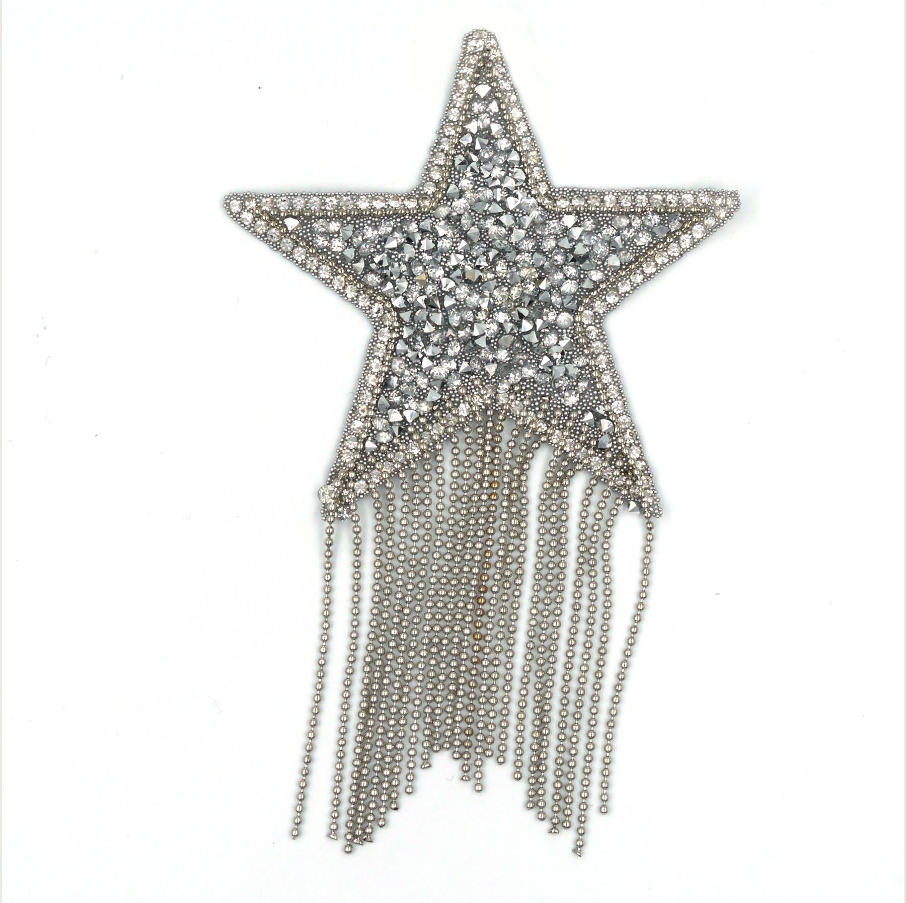 Sold individually. Sparkling textured crystal star, with beads and trailing chains Hot-fix, iron-on application.