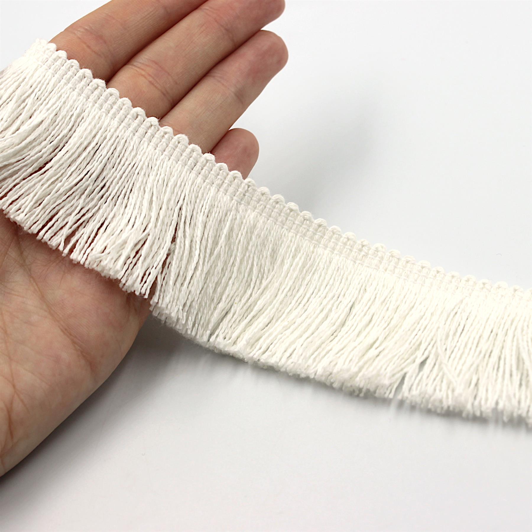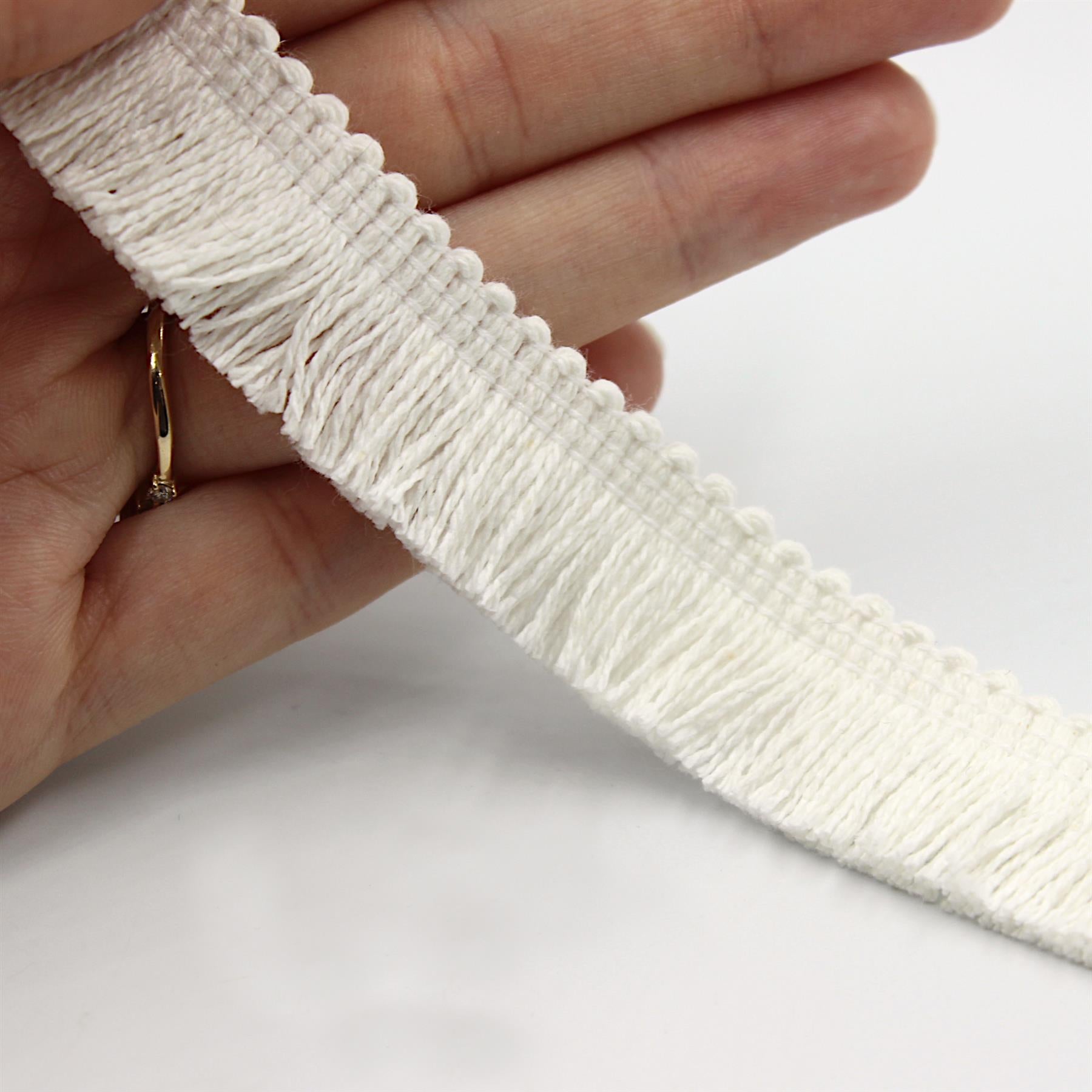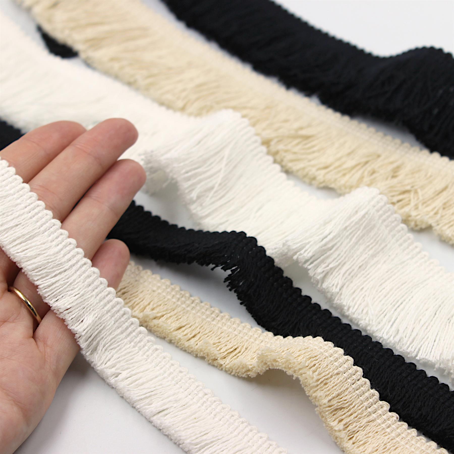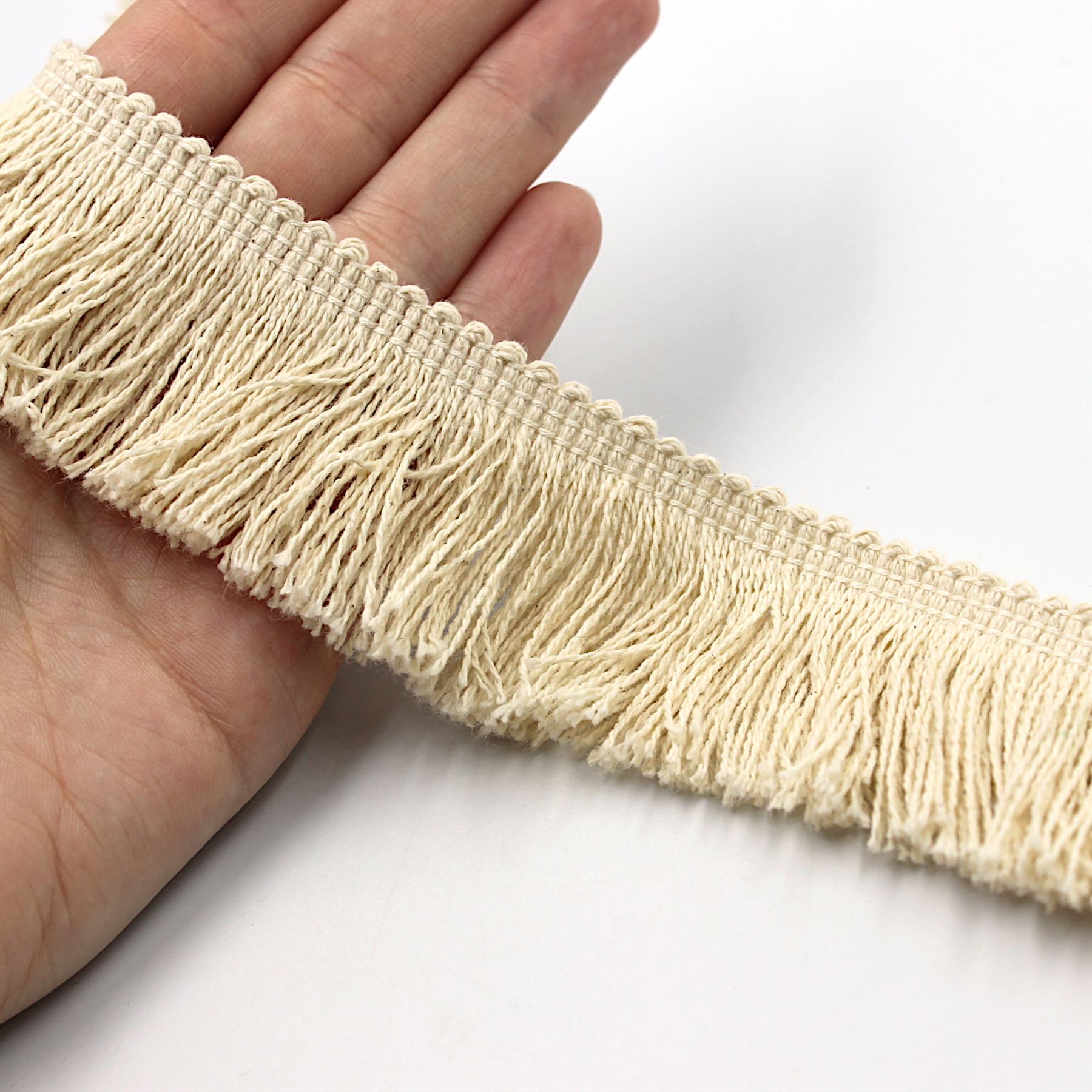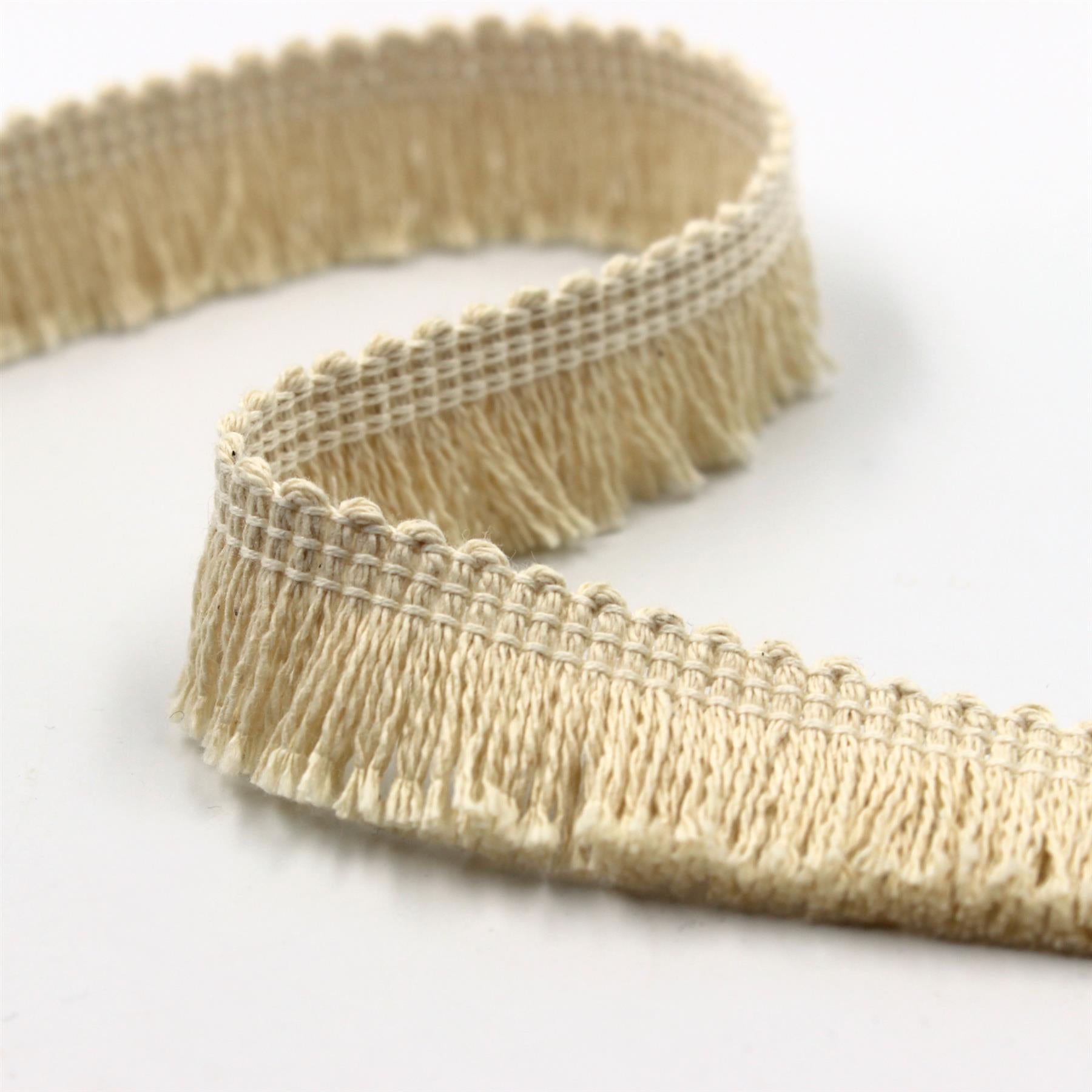 A soft, flexible cotton fringe trim with a rustic texture and natural finish. It’s perfect for adding tactile interest and charm to fashion, costume design, and craft projects.