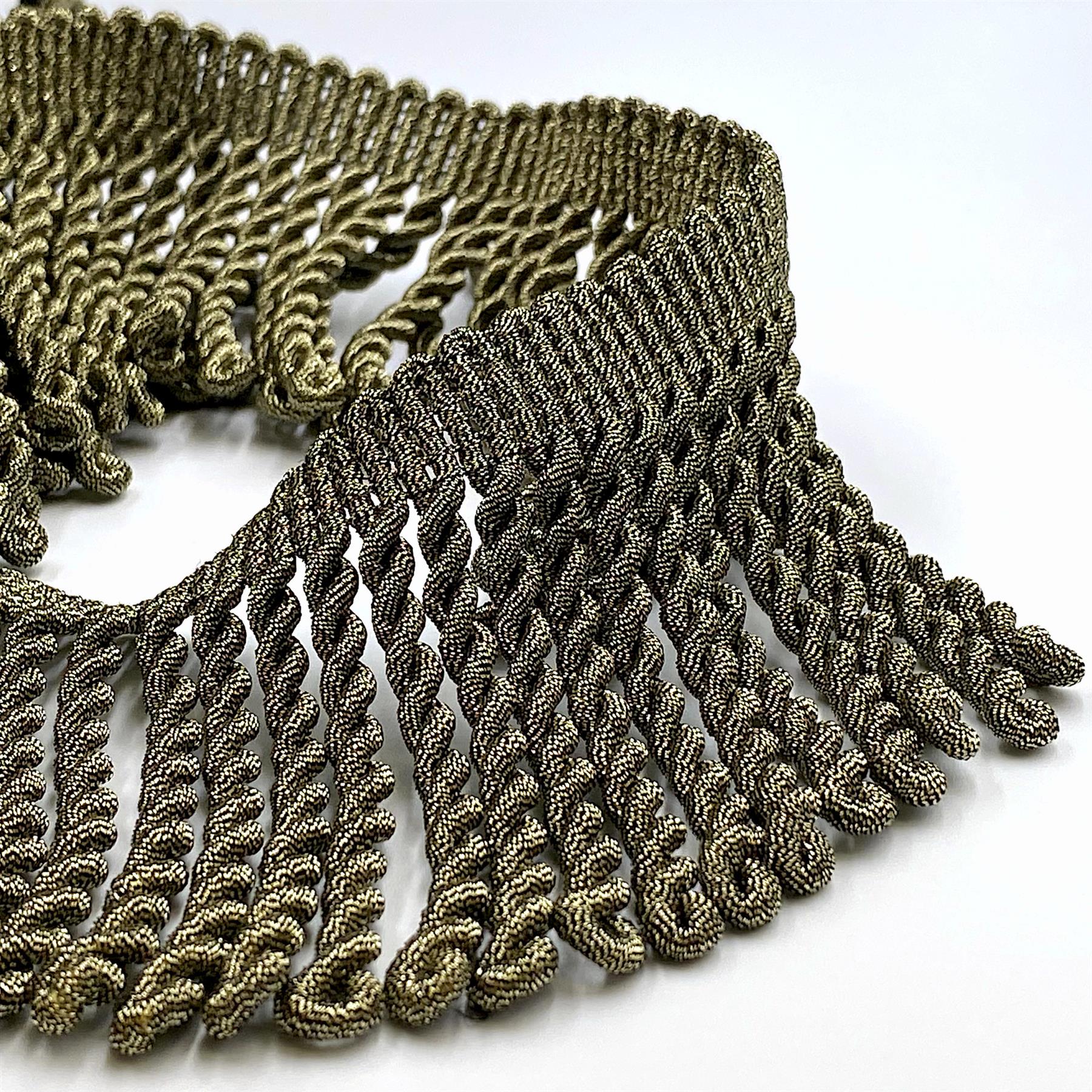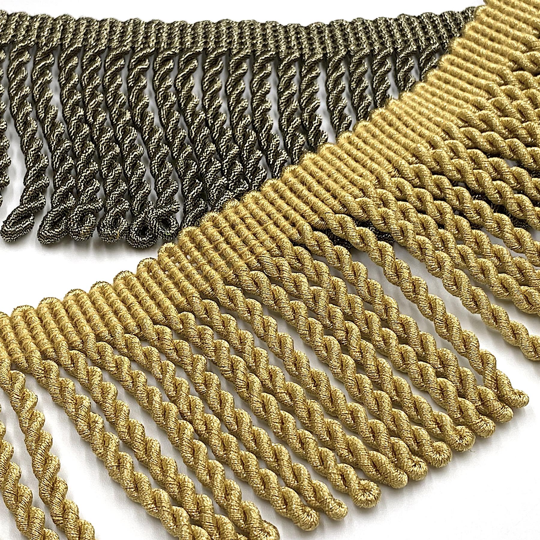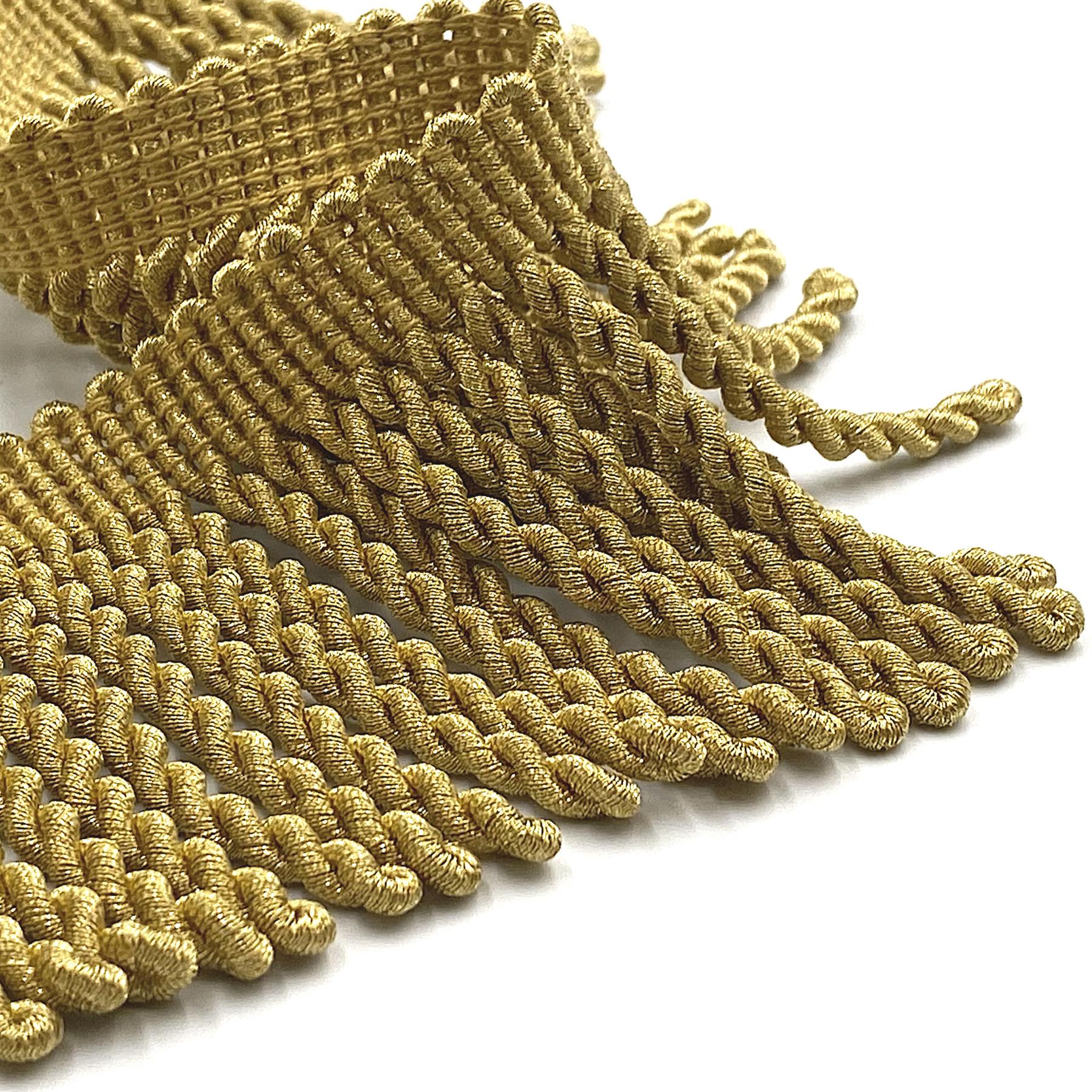 This luxurious, full metallic, bullion fringe is designed to bring a regal touch to any project. Its rich texture and shimmering finish make it ideal for furnishings, upholstery, drapery, stage and film set decoration, as well as costumes.