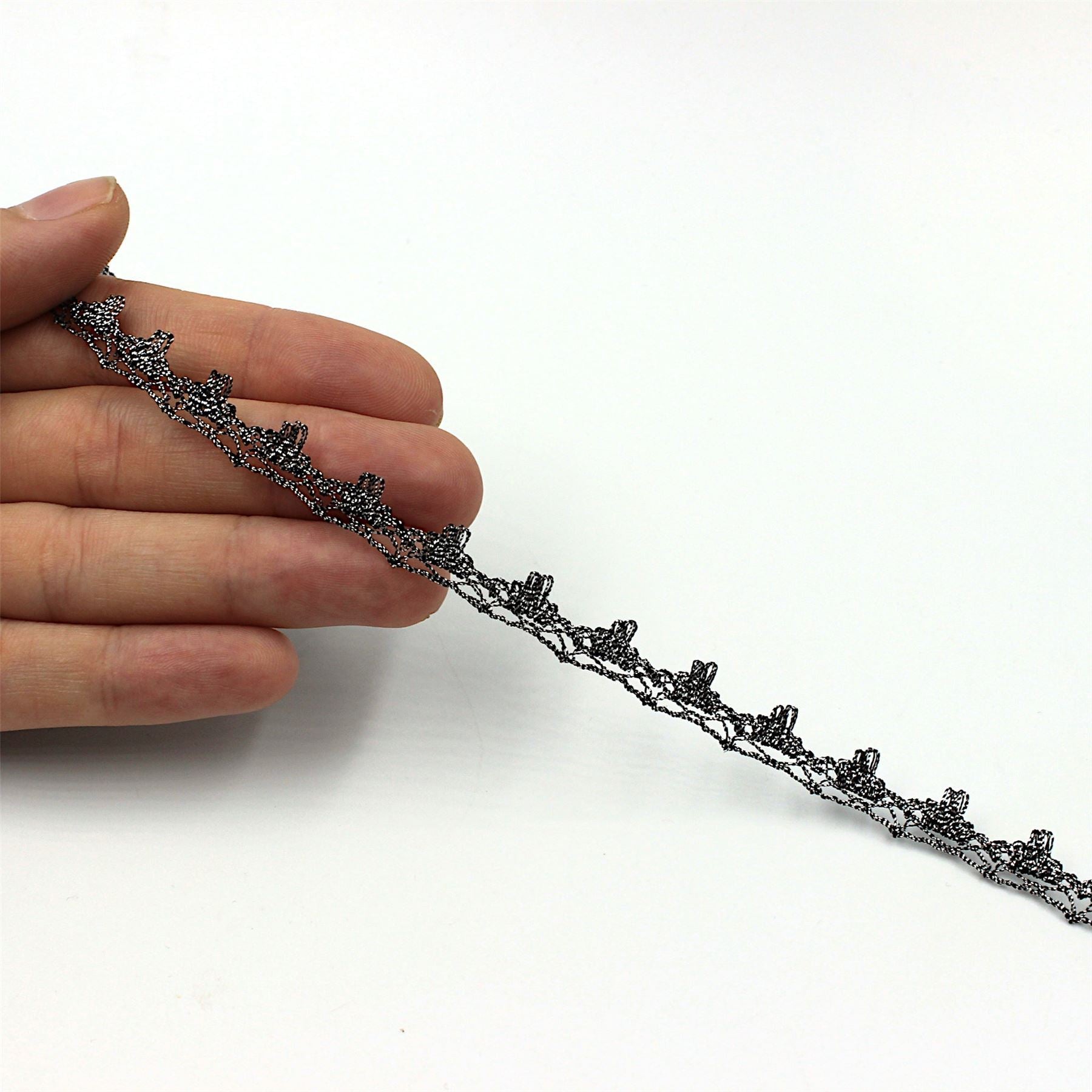 A beautiful dainty metallic lace for edging or embellishing the most delicate of designs. 1. Sold by the metre 2. Available in a variety of metallic shades. 3. 8mm at widest point.