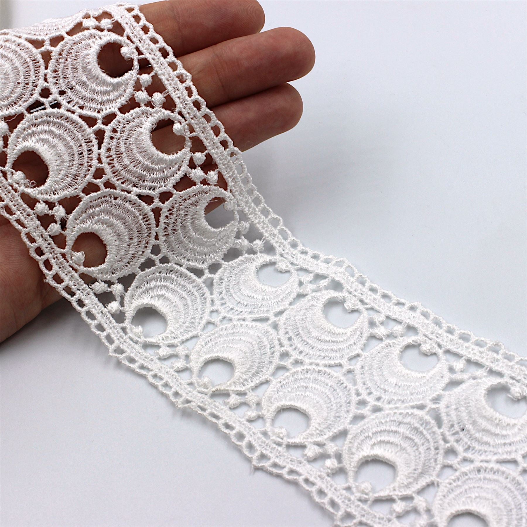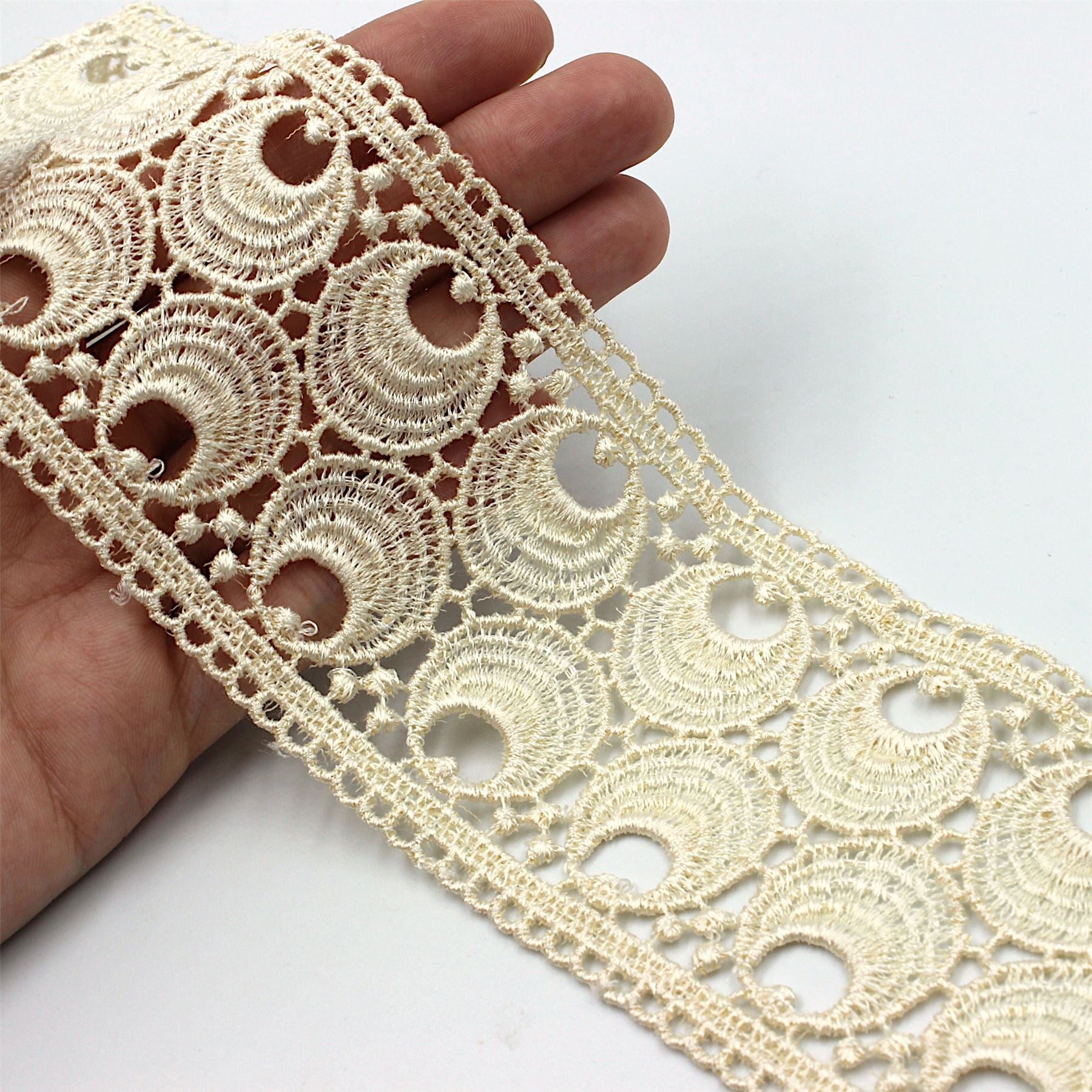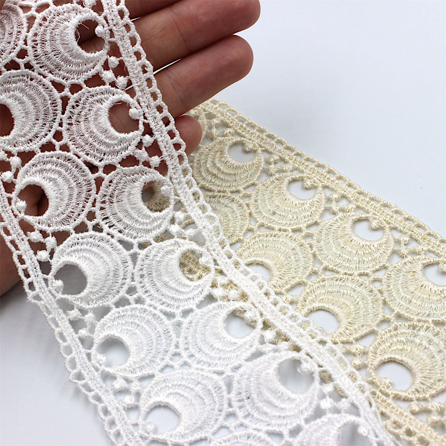 This guipure lace has a very usual, almost retro design which will stand out on your project. We love it for 60's and 70's style fashion or interiors projects, but there are hundreds of ways to use this lace to enhance your design. 1. Sold by the metre 2. Available in White or Cream 3. 65mm wide.