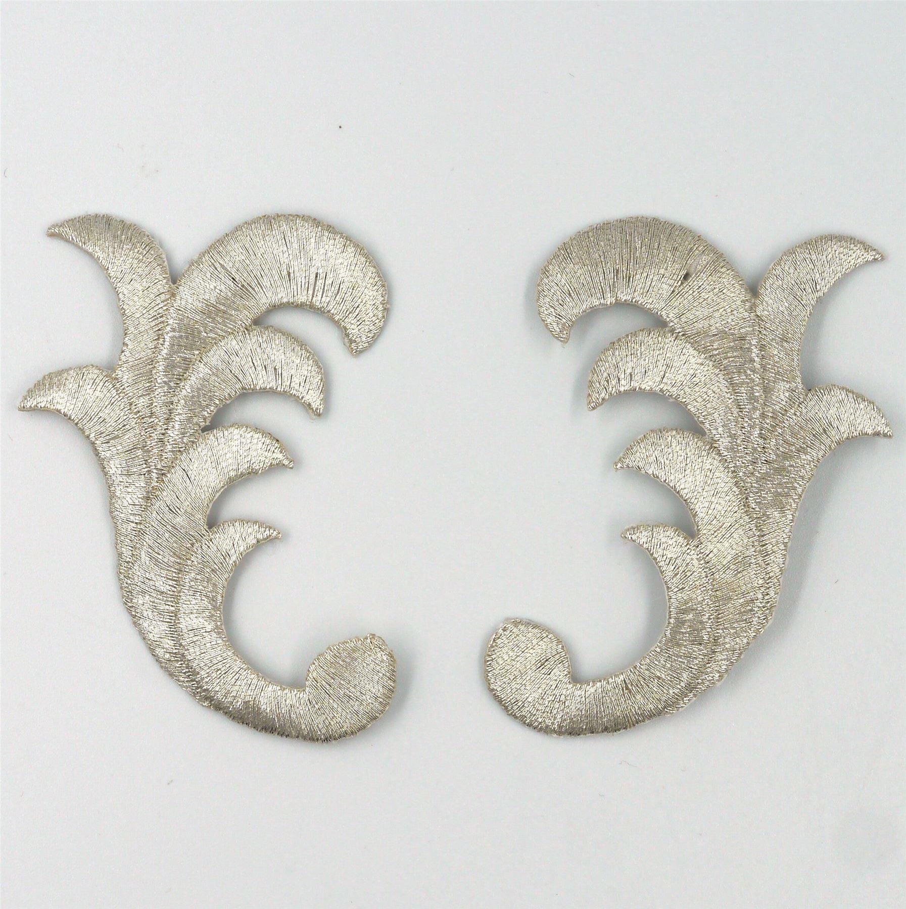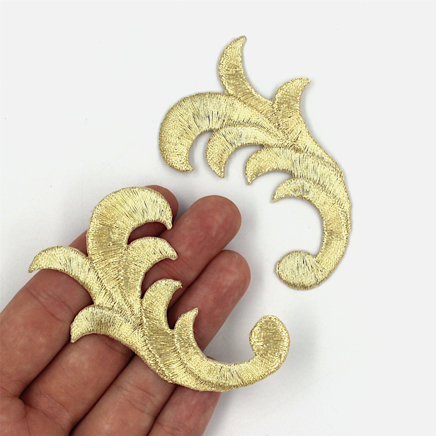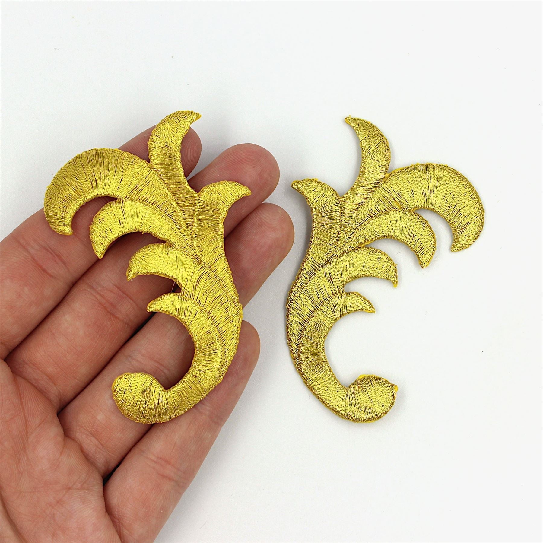 1. Sold as a mirror-image pair. 2. Available in gold, silver and champagne. 3. 7.5cm long, 5cm at widest point. 4. Iron-on backing 5. Perfect for fashion, costume and craft.