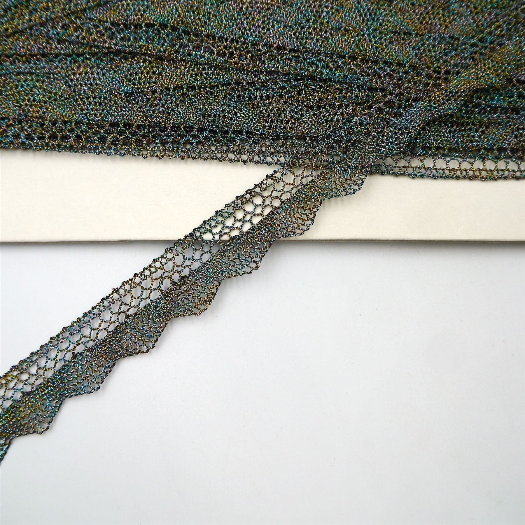 1. Sold by the metre 2. Beautiful, multicoloured metallic lace 3. Great for fashion, interiors or costume. This unusual lace is made from dark metallic, multicoloured thread, woven into a fine, ornate design that will add a luxurious finish to your project.