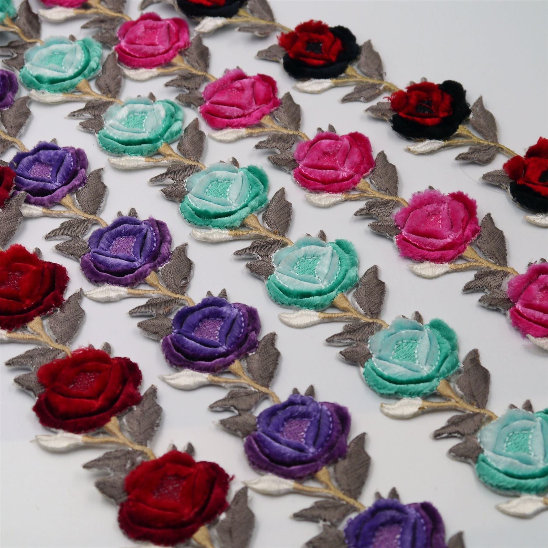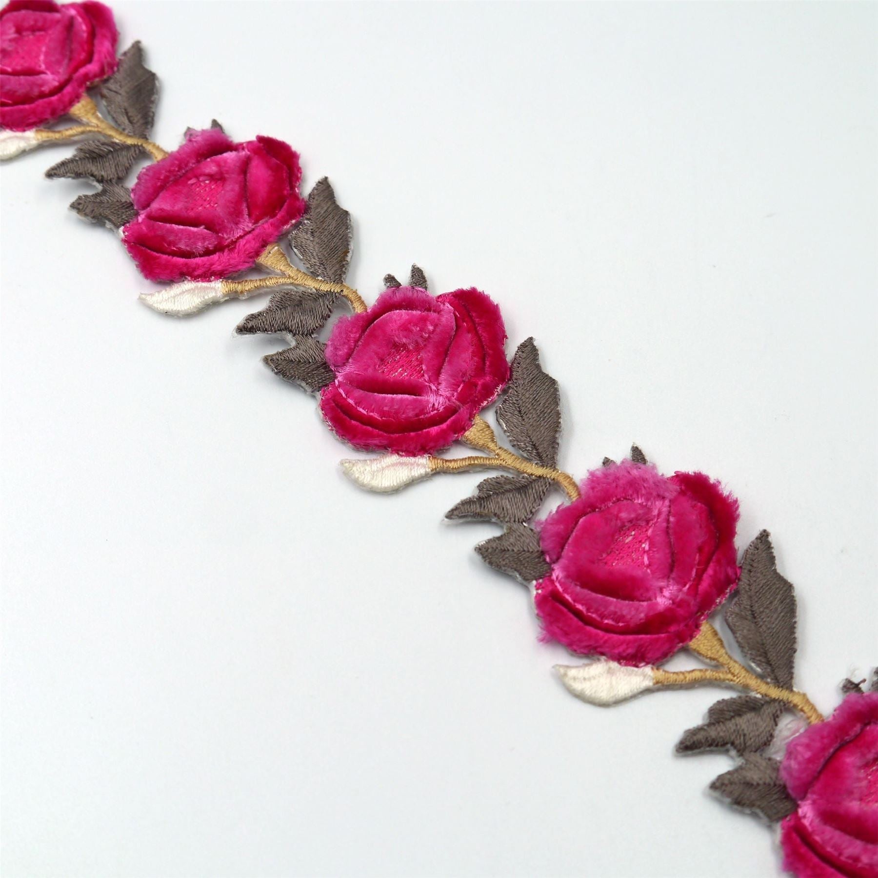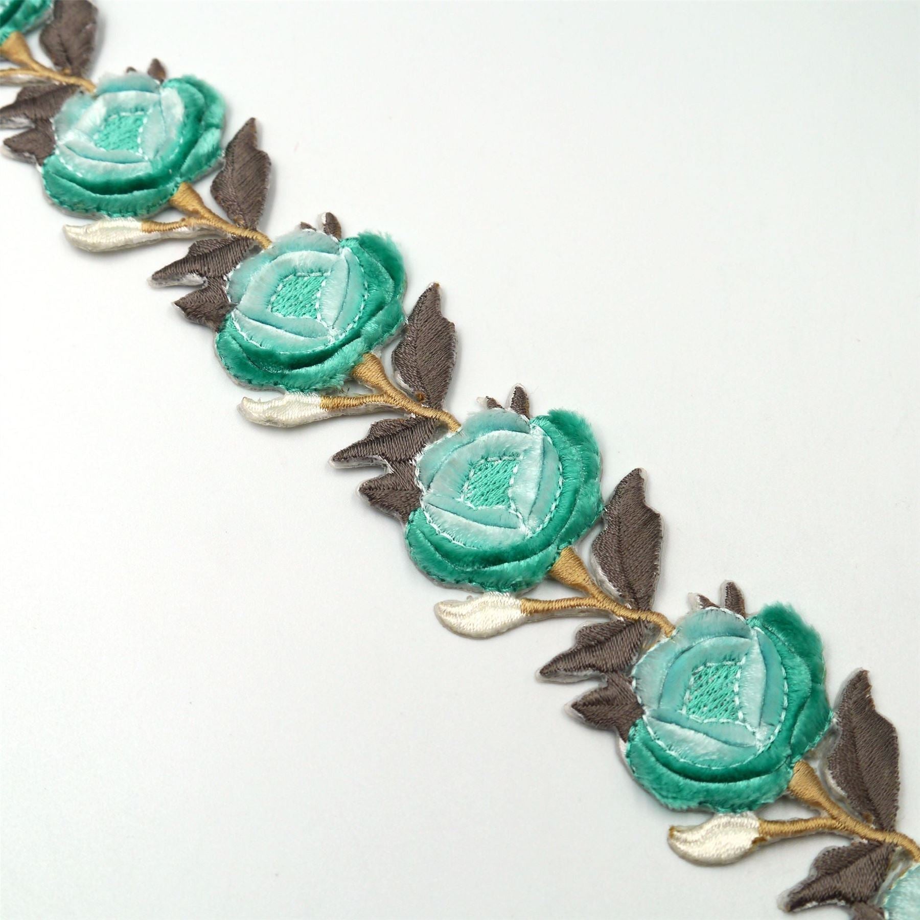 1. Sold by the metre 2. Available in a range of different colour combinations This flower braid combines beautiful chenille rose motifs with elegant embroidered leaves to create a trim that is eye-catching and tactile. The iron-on backing makes it easy for this trim to be attached to whatever project you are working on, and can be used as a continuous trim, or cut up into individual motifs.