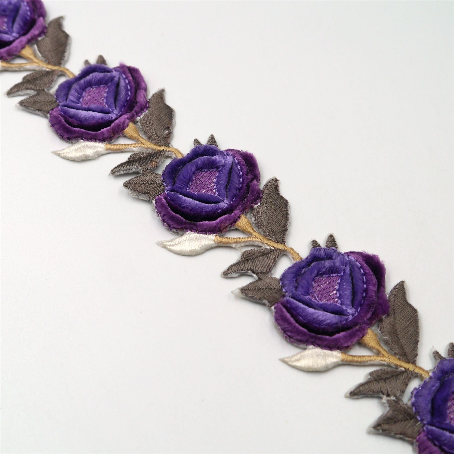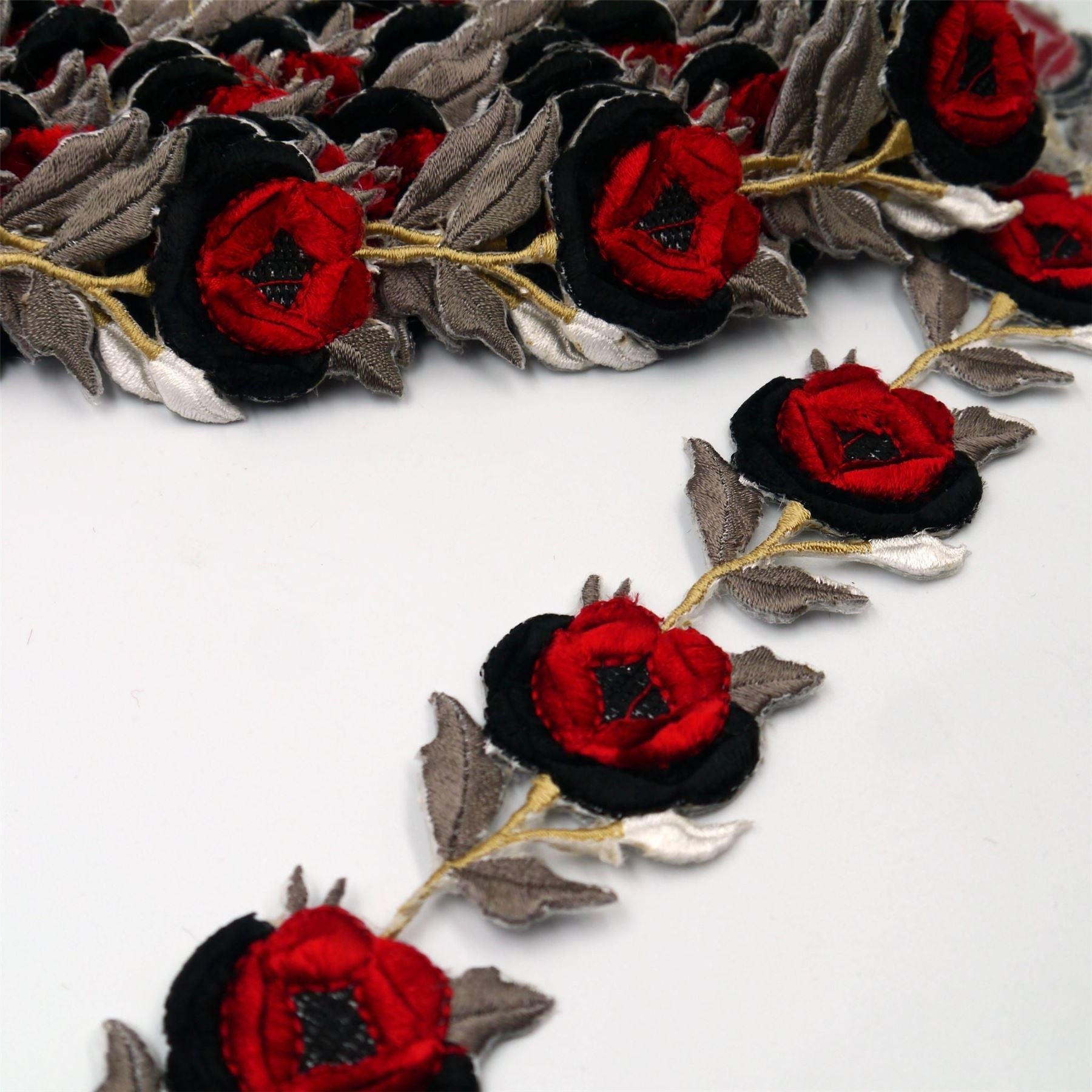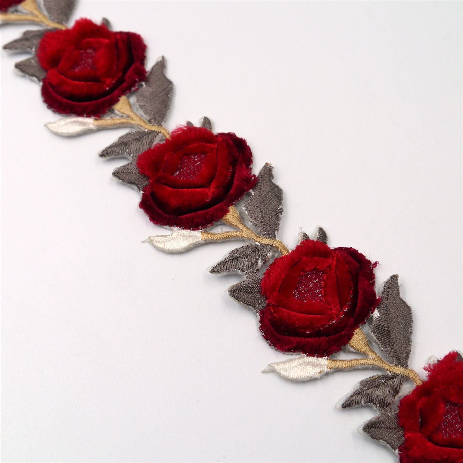1. Sold by the metre 2. Available in a range of different colour combinations This flower braid combines beautiful chenille rose motifs with elegant embroidered leaves to create a trim that is eye-catching and tactile. The iron-on backing makes it easy for this trim to be attached to whatever project you are working on, and can be used as a continuous trim, or cut up into individual motifs.